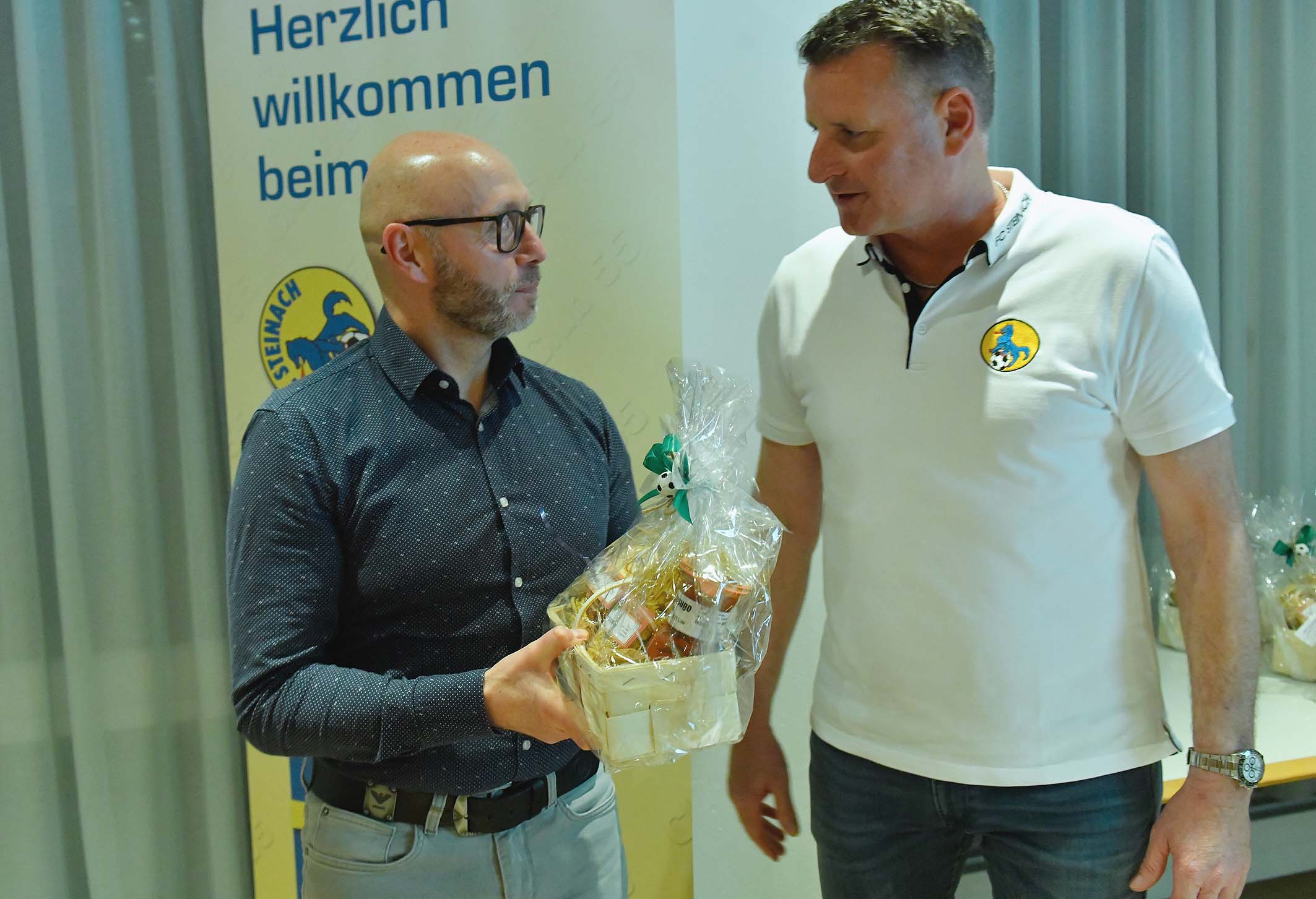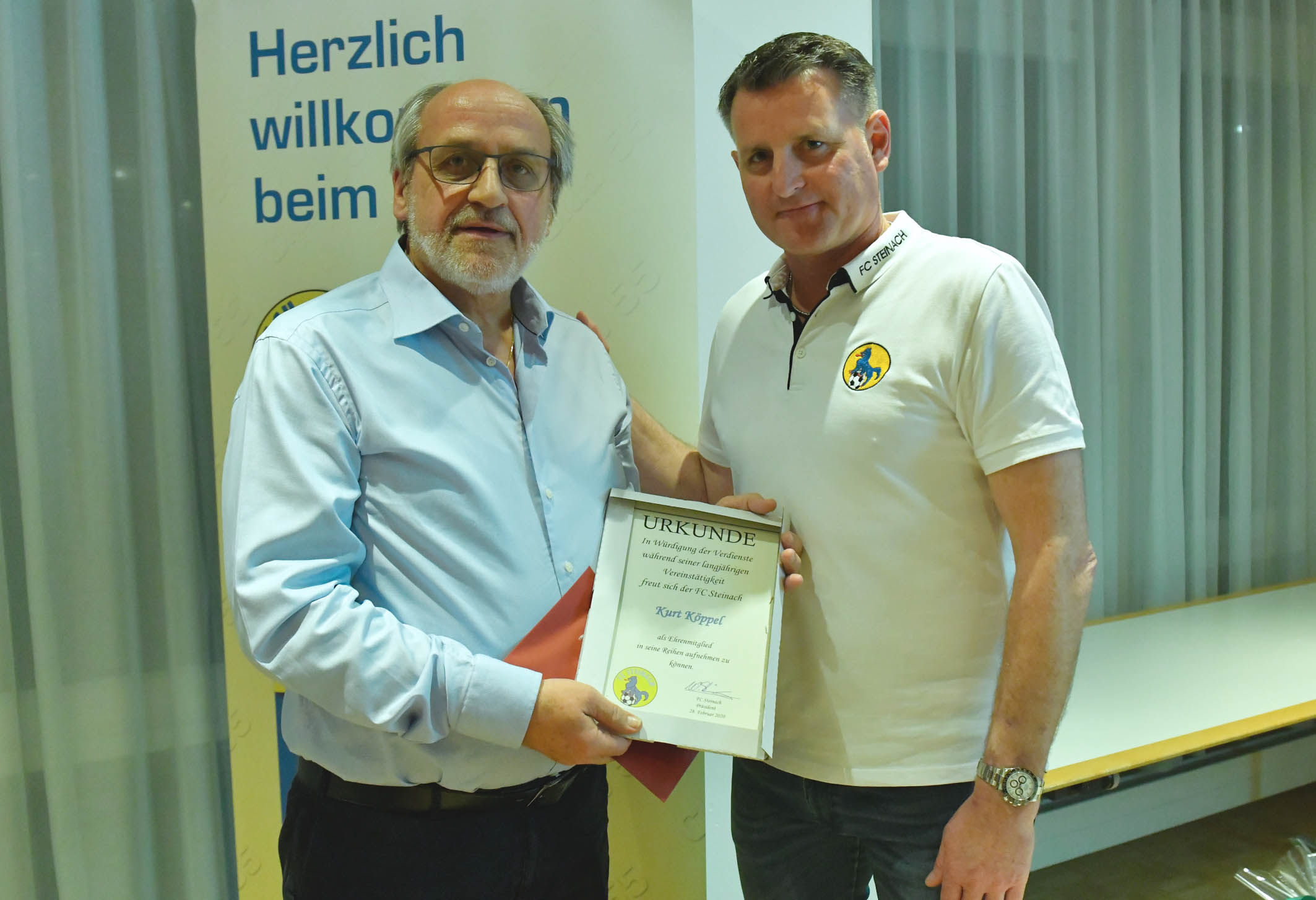Juniorentrainer/Aktivtrainer, Christian Fehr, Juniorentrainer und Hausi Maag, Seniorenobmann. Zwei Mitglieder standen während 30 Jahren in ihren Ämtern: Erich Hädinger, Trainer und Bruno Helfenberger, zuständig für die Postverteilung. Eine weitere Ehrung erfuhren die beiden letztgenannten Mitglieder für 50 Jahre Vereinszugehörigkeit. Dazu sagte Präsident Wolfgang Steiger: „Sie sind seit dem Juniorenalter im FC Steinach und haben in dieser Zeit auch viele Tore geschossen und stets um Punkte gekämpft. Zudem sind sie immer mit grossem Engagement dabei und haben neben dem Fussballspiel auch unendlich viele Frondienst-Stunden geleistet. – Mit der Ehrenmitgliedschaft wurde Kurt Köppel ausgezeichnet. Er ist nicht nur langjähriges Mitglied der Marketingkommission, er ist auch Gründungsmitglied der Gönnervereinigung FCS 2000, einer Gruppierung, die die finanziellen Belange des FC Steinach in den letzten zwei Jahrzehnten positiv beeinflusste. Und bei der Produktion des neuen FCS-Magazins „Steinacher Clubcorner“ hat er auch tatkräftig mitgeholfen.