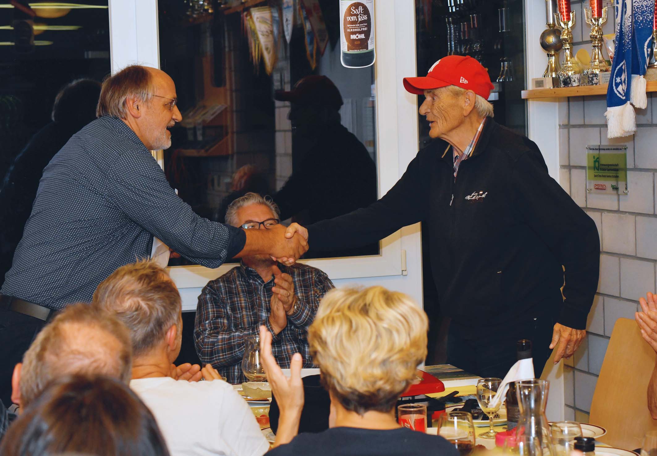 Das Spielergebnis verdauten die Mitglieder der Gönnervereinigung. Denn sonst stimmte alles, das Wetter, der Weisswein beim Apéro und auch die Stimmung. Aline Egli konnte eine grosse Zahl Mitglieder begrüssen und auch FC Präsident Wolfi Steiger ergriff das Wort. Er äusserte sich zufrieden über die aktuelle Situation des Vereins, sowohl betreffs der sportlichen Aktivitäten innerhalb des FC wie auch jenen in der Gönnervereinigung. Und nun wartete auf die Anwesenden das Raclette-Essen, das tipp-topp vorbereitet wurde von Marlis Hengartner und Silvia Frei. Und es war nicht nur ein Genuss, sondern auch eine unterhaltsame Rund, eine erbauliche Angelegenheit. Auf der Einladung wurde den Mitgliedern noch ein ganz besonderes Highlight versprochen, ein Interview mit einem Stargast. Tatsächlich ist diese Formulierung nicht ganz falsch, gehört er doch zu jenen Steinachern, die es ermöglichten, dass der FC Steinach bereits das 50Jahr-Jubiläum feiern konnte. Mit Wisi Purschke, er feiert seinen 80. Geburtstag, war bei der Gründung des Vereins ein ganz starkes Zugpferd mit von der Partie. Kurt Köppel moderierte das Gespräch und die Zuhörenden erfuhren aus berufenem Munde, was damals lief bis es zur Gründung des Vereins kam und bis der Fussballplatz im Schöntal gebaut werden konnte. Das Kämpferherz von Wisi war gut zu spüren bei seinen Schilderungen. Für etliche der Anwesenden waren die Schilderungen bekannt. Doch für die jüngere Generation dürften die Aussagen Beleg dafür gewesen sein, dass in jenen Jahrzehnten solche Vorhaben nicht einfach zu realisieren waren.